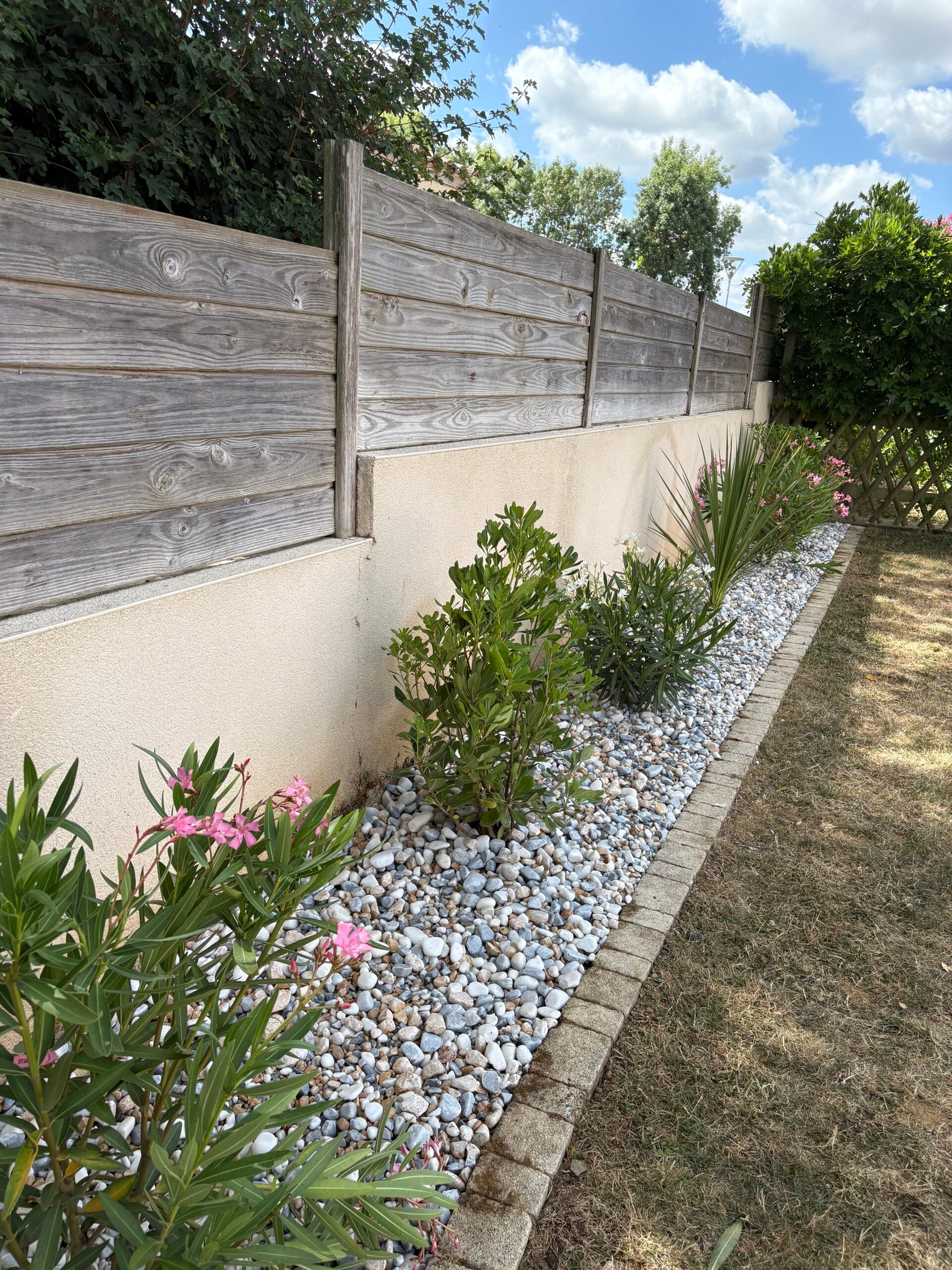 Aménagement d'un massif en bord de piscine, clôture ganivelle entres arbres, bandes de propretés et gazon