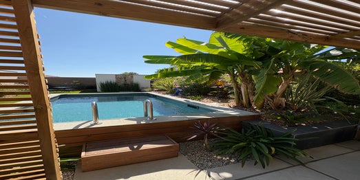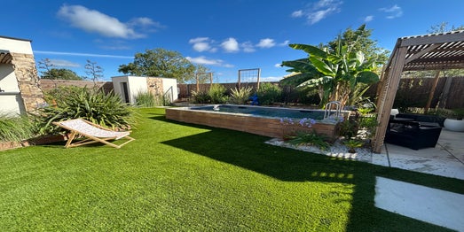 - Terrasse bois, bordures de massifs et habillage piscine en bois exotique.